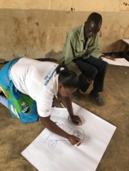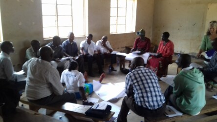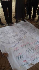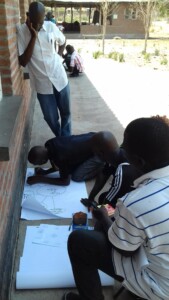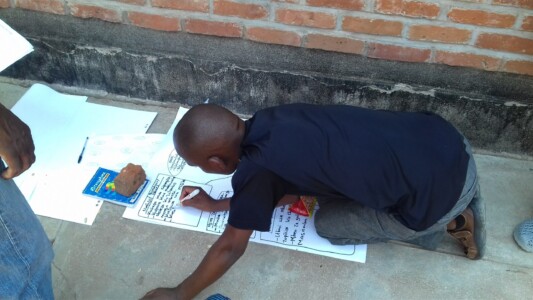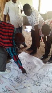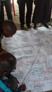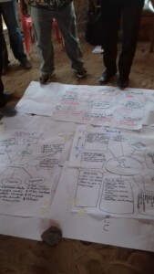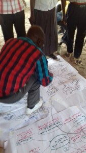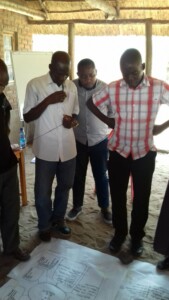 All of this may sound rather abstract.  To show rather than tell about the essence of the mapping process – which are not the map artefacts but the PARTICIPATION process – below you find some photo impressions of how very much alive the various kickoff participatory mapping processes were. They capture the flow (and fun!) of participants mapping together in four subsequent steps: (1) training the agricultural extension officers in the capital Lilongwe; (2) the first mapping workshop with the Kalolo ASP (Area Stakeholder Panel) representatives, (3) the second mapping workshop with their peers of the Mbwadzulu ASP, and (4) a sneak preview of the subsequent scaling up the approach.