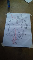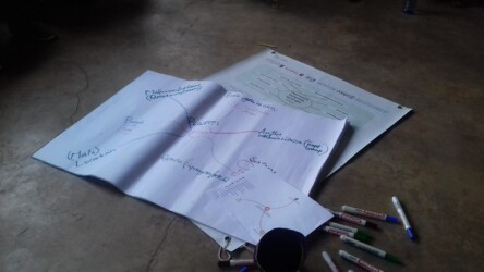 Key to the Malawi implementation of our participatory collaboration mapping approach is that local agricultural communities are owners of their own maps. The mapping approach is being used by agricultural coordination platforms made up of diverse agricultural stakeholders (e.g., businesses, farmers, researchers, extensionists, etc.) who map initiatives within the communities where they work. As most villages do not have electrical power, posters are used to map several local initiatives at each session, thus spanning the digital divide. These initiative maps are then presented in turn to the overall session group by the community members. Symbolic connections between elements that the initiative maps have in common are made by connecting the posters with pieces of thread. The posters remain with the communities, since they are the owners of their own content.