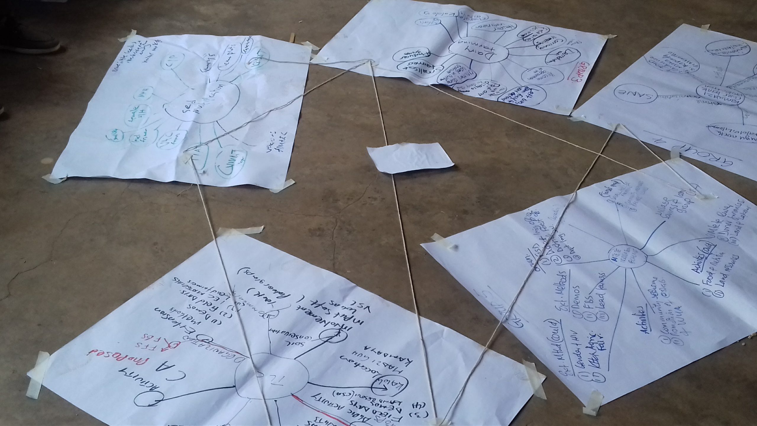 Key to the Malawi implementation of our participatory collaboration mapping approach is that local agricultural communities are owners of their own maps. The mapping approach is being used by agricultural coordination platforms made up of diverse agricultural stakeholders (e.g., businesses, farmers, researchers, extensionists, etc.) who map initiatives within the communities where they work. As most villages do not have electrical power, posters are used to map several local initiatives at each session, thus spanning the digital divide. These initiative maps are then presented in turn to the overall session group by the community members. Symbolic connections between elements that the initiative maps have in common are made by connecting the posters with pieces of thread. The posters remain with the communities, since they are the owners of their own content.