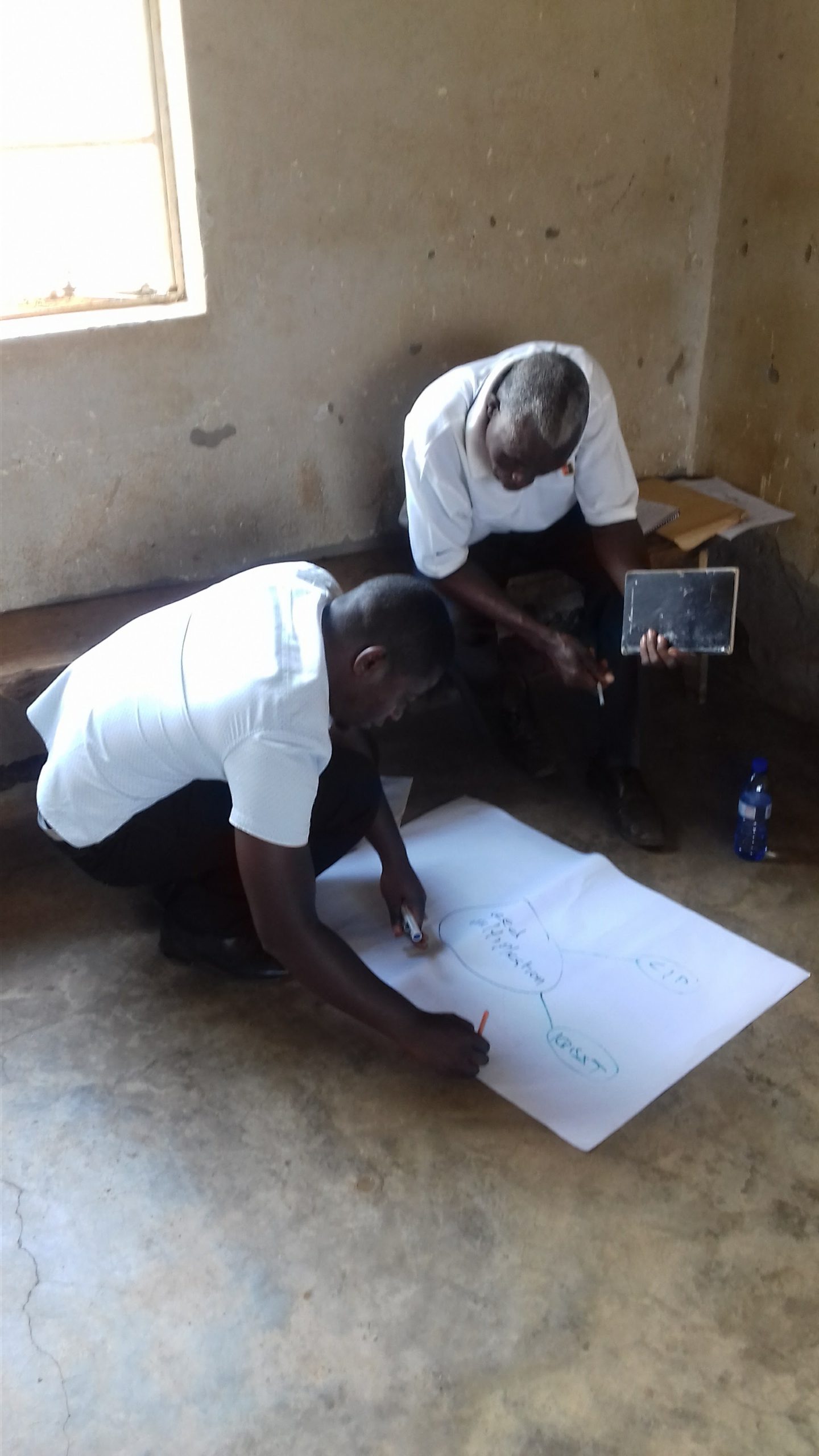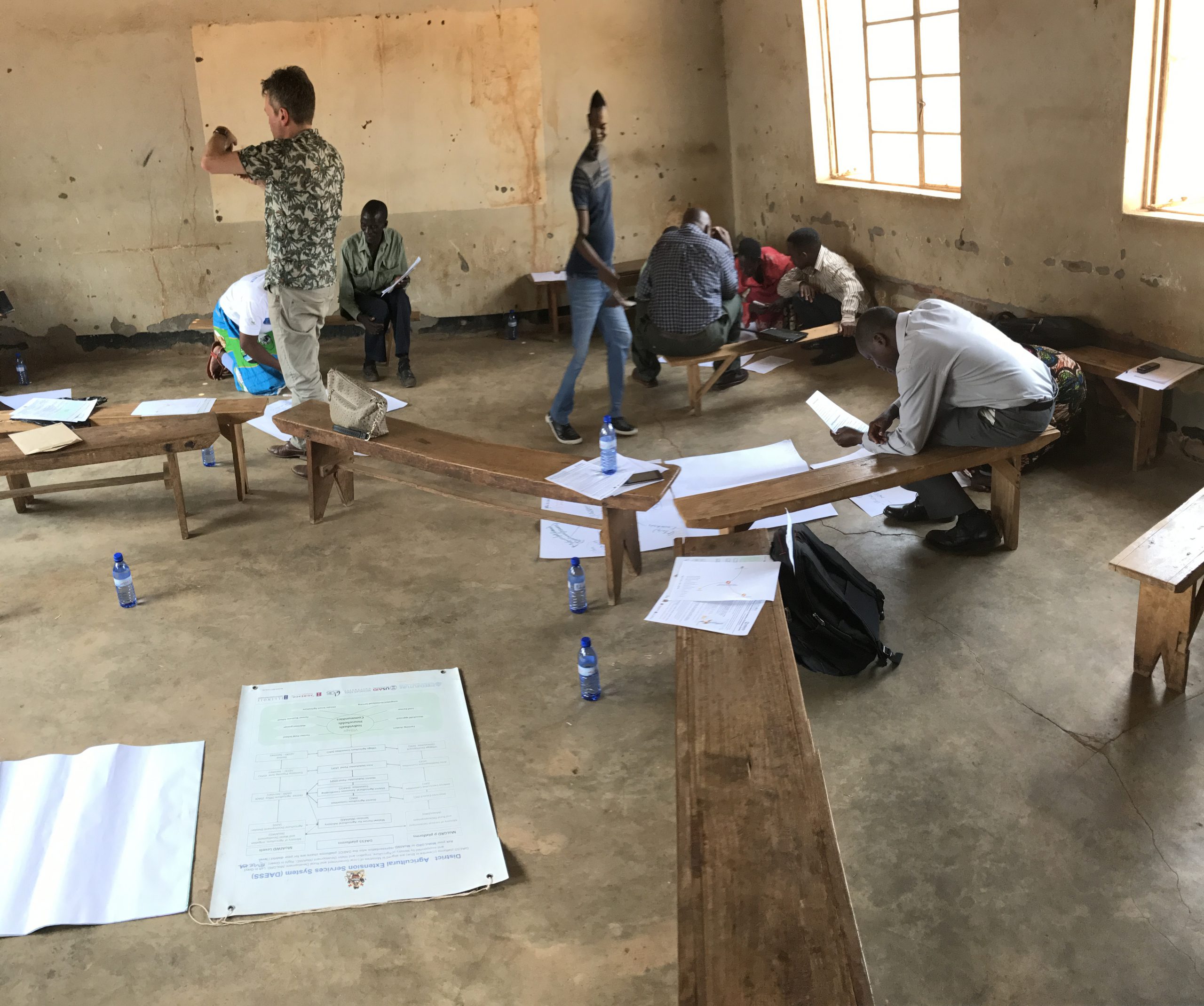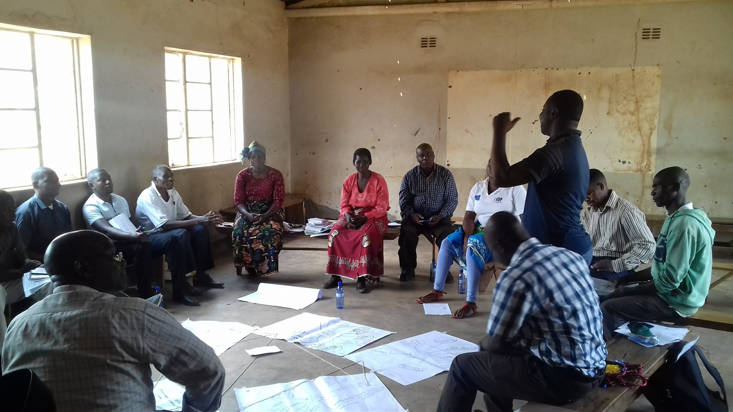 All of this may sound rather abstract.  To show rather than tell about the essence of the mapping process – which are not the map artefacts but the PARTICIPATION process – below you find some photo impressions of how very much alive the various kickoff participatory mapping processes were. They capture the flow (and fun!) of participants mapping together in four subsequent steps: (1) training the agricultural extension officers in the capital Lilongwe; (2) the first mapping workshop with the Kalolo ASP (Area Stakeholder Panel) representatives, (3) the second mapping workshop with their peers of the Mbwadzulu ASP, and (4) a sneak preview of the subsequent scaling up the approach.